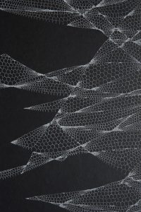 It’s captivating work, transfixing the beholder momentarily in the passage of time. The drawings are beautiful in form, with an ethereal fragility to the delicate cobweb like structures, which seem at once to embody universes of stars, moons, planets, people.